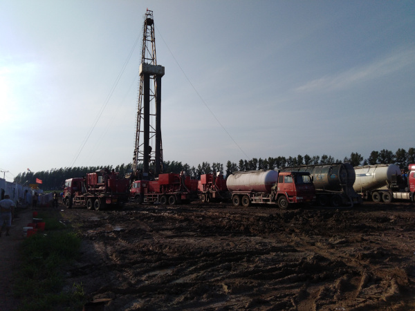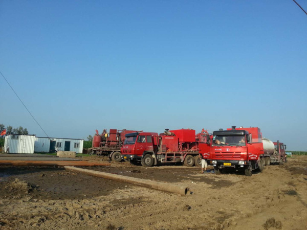 伊22-15-17井,油層套管的固井施工,于2018年7月19日開(kāi)始,17點(diǎn)30分?jǐn)[好灰罐和泵車(chē)等固井車(chē)輛,老天眷顧,天氣不錯(cuò),一切準(zhǔn)備就緒。